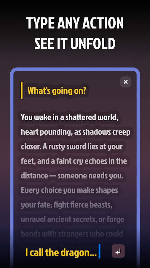 — Полный творческий контроль. Введите любое действие, диалог или идею, и генератор историй с ИИ создаст динамичную текстовую ролевую игру, которая развивается в реальном времени в соответствии с вашими решениями, предлагая безграничные фэнтезийные приключения с ИИ.