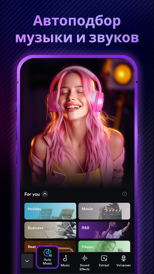 С помощью этого Редактор Видео вы можете создавать видео с фотографиями, обрезать видео, добавлять фото и накладывать видео, обрабатывать видео с помощью эффектов для видео и фильтров, извлекать и добавлять музыку, добавлять текст к видео.