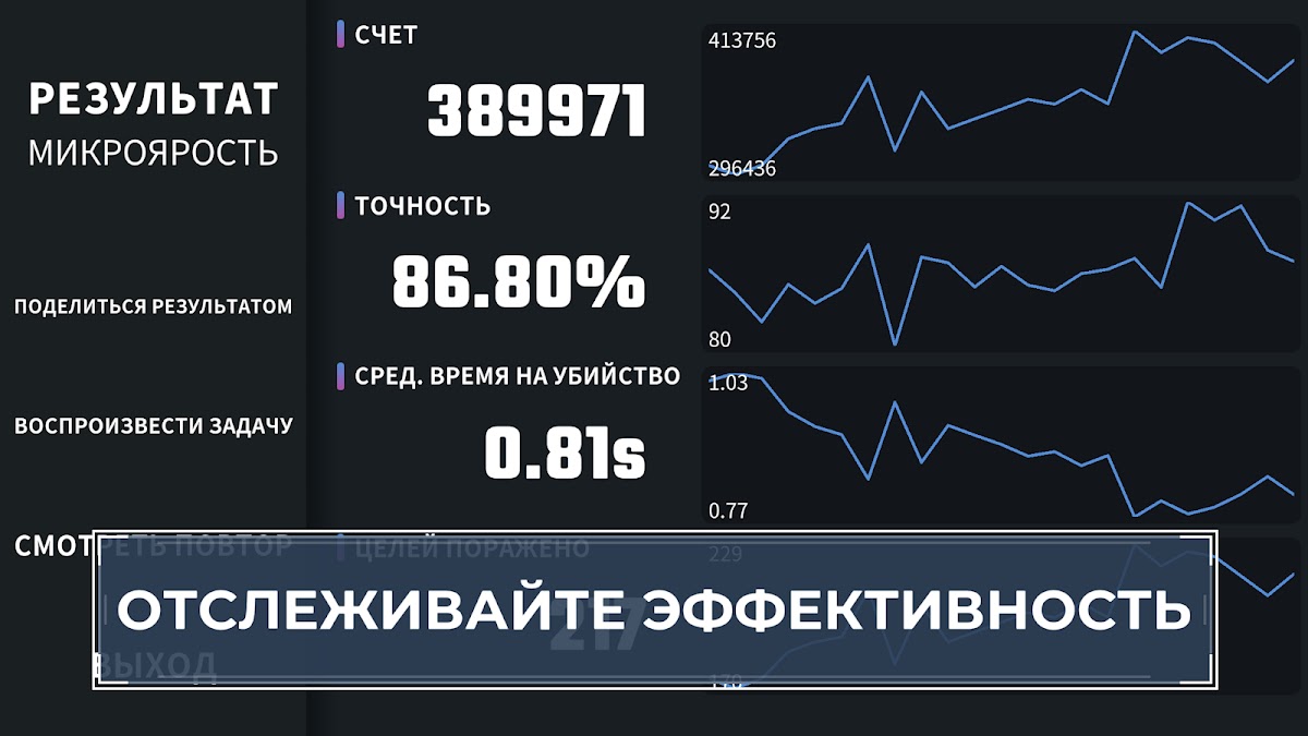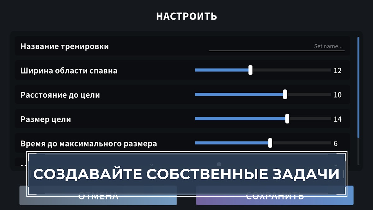На выбор предлагается более 30 тренировочных заданий, все из которых помогут вам улучшить различные области вашего навыка прицеливания. Все задания очень легко настраиваются — от размера и положения мишени до скорости игры.