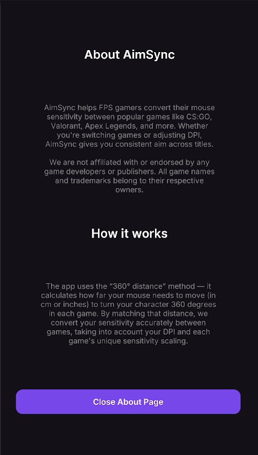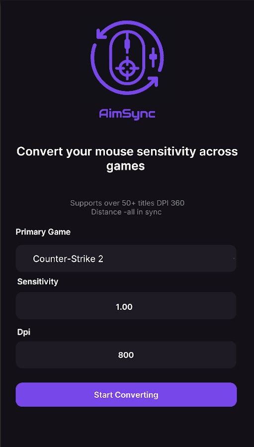Независимо от того, переходите ли вы с Valorant на CS2, Apex Legends или Fortnite, AimSync гарантирует, что чувствительность вашей мыши будет одинаковой, давая вам преимущество в каждой игре. Больше никаких догадок, никакой траты времени — только плавные и точные переходы прицеливания между играми.