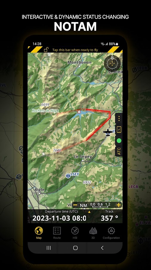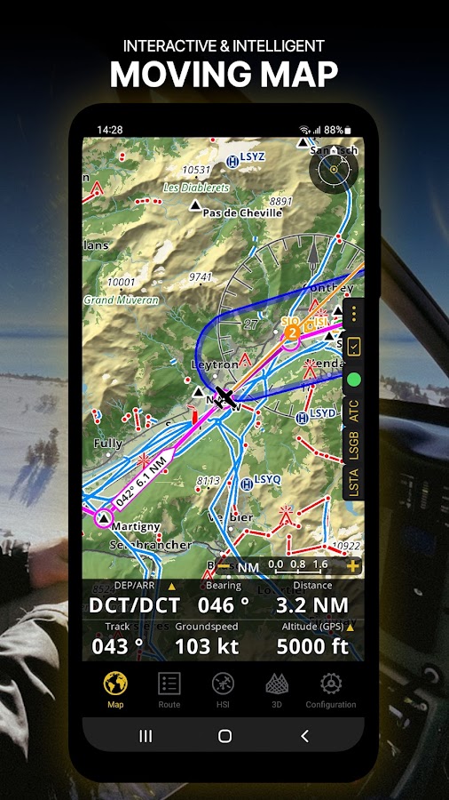 Планируйте и навигируйте с помощью нашей интерактивной карты. Выбирайте между аэронавигационными картами, спутниковыми изображениями или нашей векторной картой в качестве фона. Кроме того, движущаяся карта отображает точки маршрута, NOTAM, препятствия и воздушные пространства из нашей всегда актуальной всемирной аэронавигационной базы данных. Нажмите на любую точку маршрута прямо на карте, чтобы легко создать маршрут. Персонализируйте значения, отображаемые на панели навигации, чтобы иметь точно ту информацию, которая вам нужна: высота, вертикальная скорость, курс, расстояние до следующей точки маршрута, расчет времени прибытия и так далее. Выберите процедуры вылета и прилета в аэропорты для вашего маршрута, чтобы они также отображались поверх движущейся карты.
