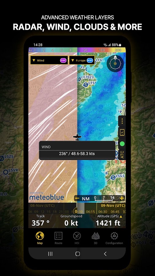 Подписчики плана Smart Advanced могут активировать прозрачные слои погоды поверх движущейся карты. Доступные слои включают дождевой радар, ветер, давление, облака и дождь, видимость, порывы ветра, а также для Германии, Швейцарии, Австрии и Балкан также GAFOR. Нажмите на любую точку на карте, чтобы увидеть информацию о погоде в этой области. Ознакомьтесь с прогнозом погоды на три дня вперед.