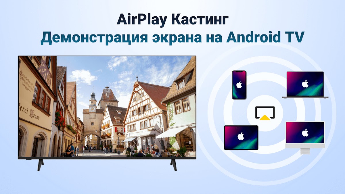 AirPlay Кастинг на Android TV— это беспроводное приложение-приемник потокового вещания, которое позволяет пользователям легко транслировать и транслировать с iPhone/iPad/Mac на Android TV через WiFi. С этим полезным приложением-приемником для трансляции вы можете напрямую транслировать экран или транслировать фотографии, веб-видео и аудио с устройств iOS на Android TV, не сталкиваясь с проблемами частого переключения с устройств Apple на устройства Android или оплаты установки дополнительных конвертеров.