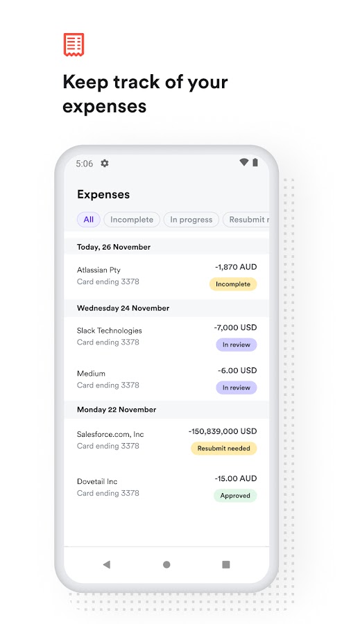 Создавайте виртуальные дебетовые карты за секунды, устанавливайте лимиты расходов и контроль, а также просматривайте все расходы сотрудников в одном месте в режиме реального времени.