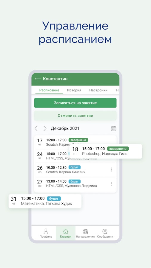 ● управляйте расписанием — составляйте удобный график, переносите уроки, записывайтесь на отработки;