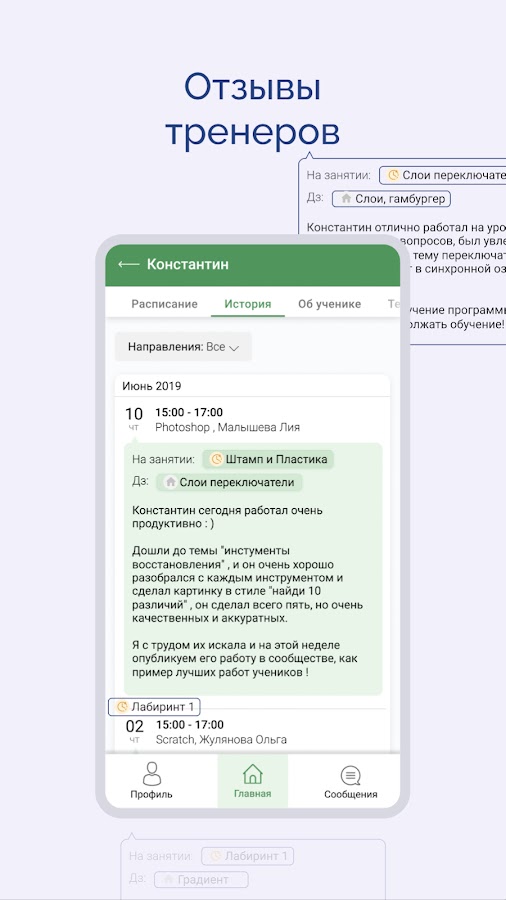 ● следите за успехами ученика — контролируйте прогресс, смотрите, какие проекты выполняет ребенок и получайте обратную связь от тренеров;
