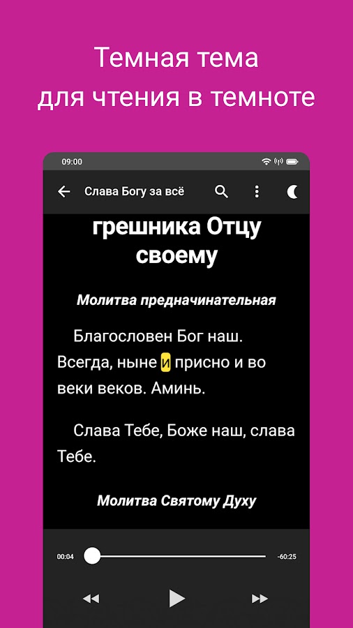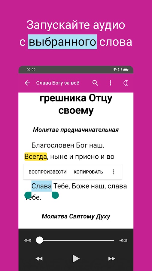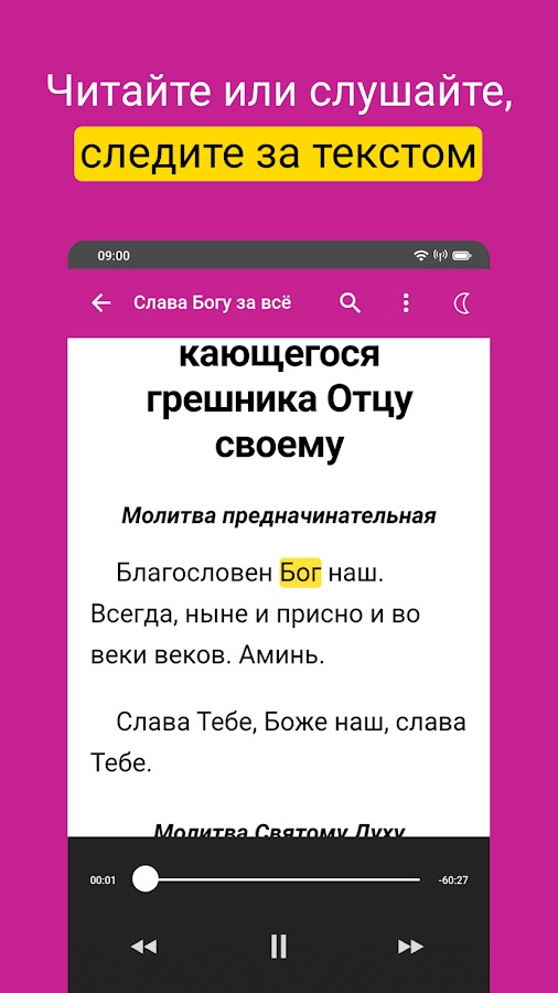 ・Уникальная подсветка слов позволяет следить за текстом во время прослушивания, помогает лучше понимать и запоминать молитвы.