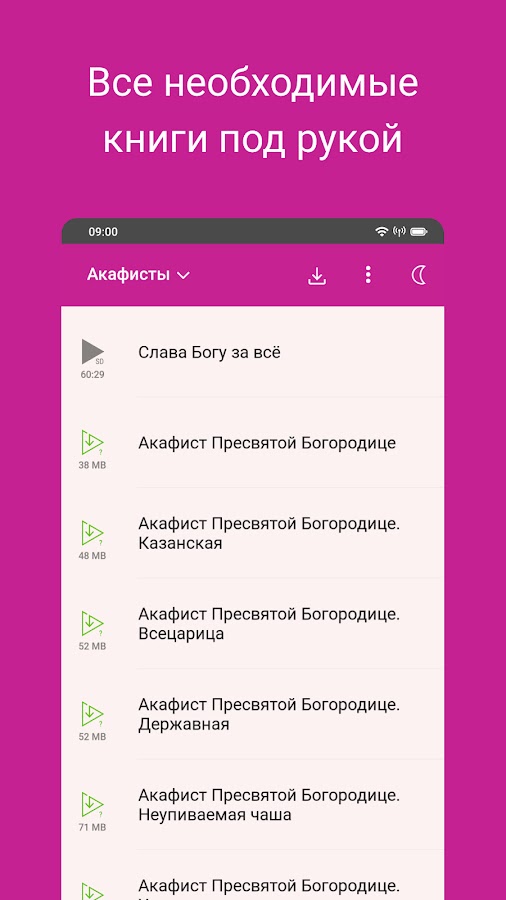 Приложение включает книги в аудио и текстовом формате: