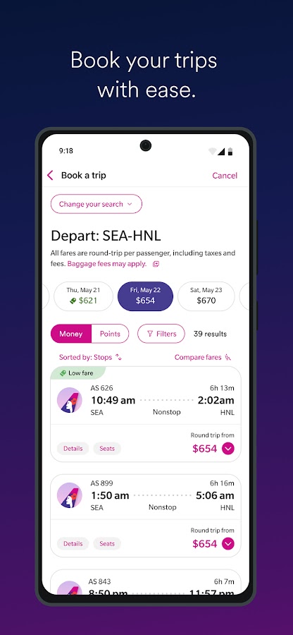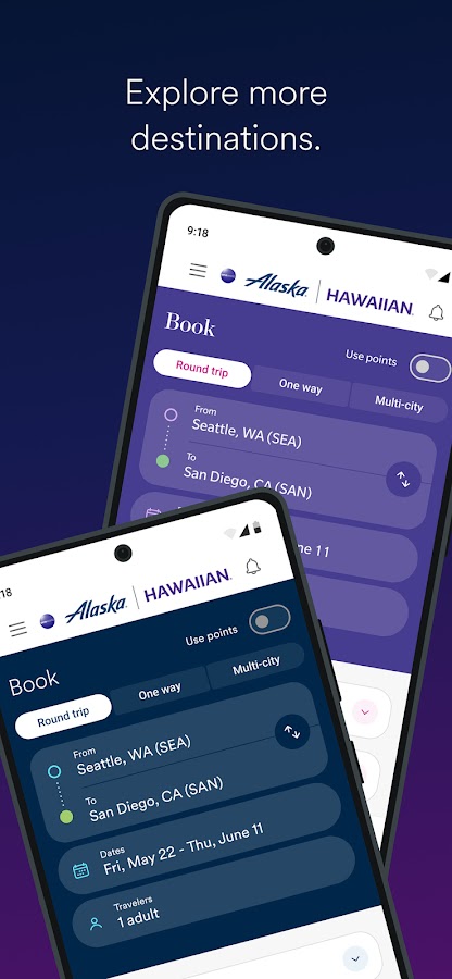Используйте приложение Alaska Hawaiian, чтобы изучать варианты, бронировать поездки, регистрироваться на рейсы и без проблем перемещаться по аэропортам. Находите всю необходимую вам информацию о рейсах в любое время.