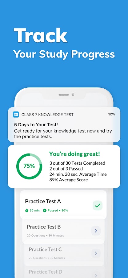 Отслеживайте свой прогресс по главам и урокам. Следите за своими результатами тестов и средним временем. Легко продолжайте с того места, где остановились, с помощью кнопки «Продолжить обучение».