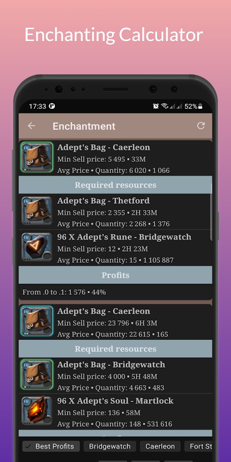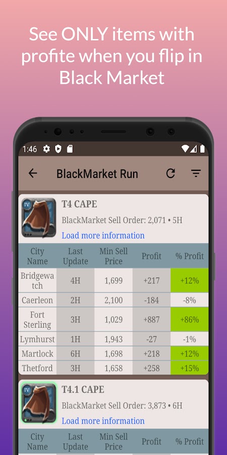 Отображайте минимальные цены продажи всех предметов во всех Королевских городах и рассчитывайте наиболее прибыльную сделку. (Покупка по самой низкой цене продажи и продажа в Королевском городе по самой высокой цене продажи).