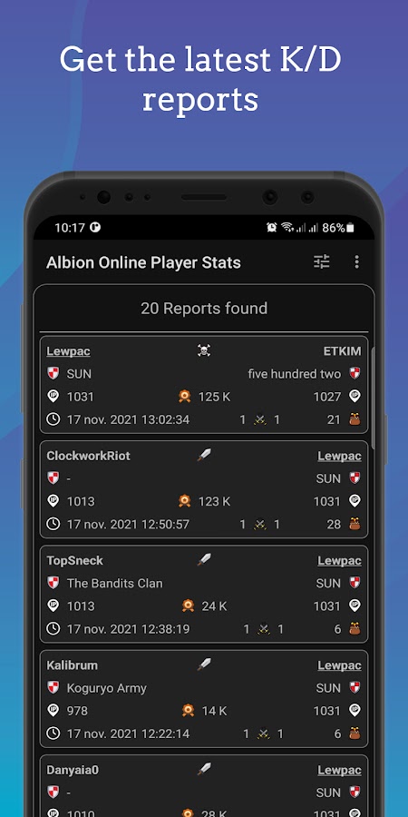 Примечание. Обратите внимание, что из каждого типа K / D выбираются только последние 10 отчетов. (Так работают онлайн-серверы Альбиона.)
