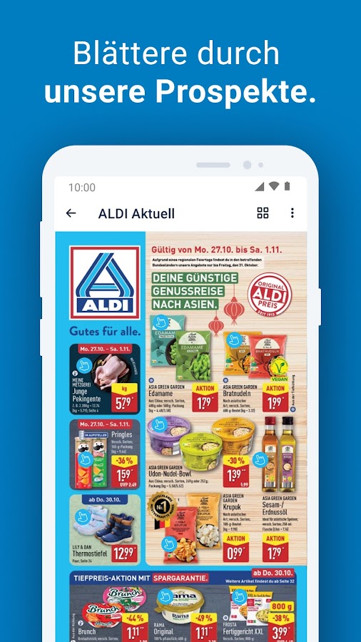 Предпочитаете просматривать предложения в печатной брошюре? Нет проблем: в приложении ALDI Nord вы найдете все самые свежие брошюры, от еженедельных предложений до нашего ассортимента вин. И самое лучшее: многие товары напрямую связаны между собой, поэтому вы можете легко получить доступ к большему количеству фотографий и дополнительной информации. Кроме того, с цифровой брошюрой вы сэкономите бумагу, помогая окружающей среде.
