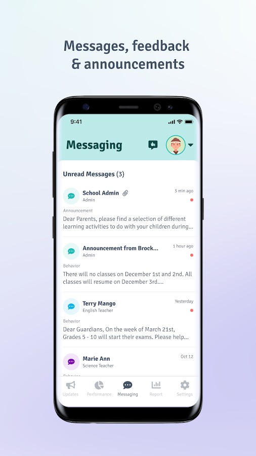 Учителя и школьные администраторы могут напрямую общаться с опекунами своих учеников с помощью индивидуальных сообщений, общих объявлений, а также могут отправлять другие новости и полезную информацию о своих детях.