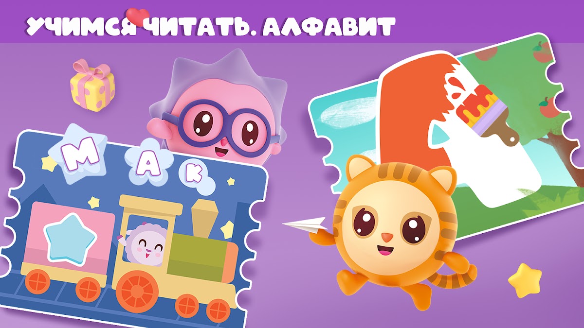 – коллекции наклеек в альбомах, где малыш сможет создавать свои собственные истории в картинках и в ролевой игре развивать свой словарный запас. Система наград делает обучающий процесс более увлекательным, ребенок радуется каждой награде и учит буковки с удовольствием. Все развивашки доступны бесплатно и без рекламы.