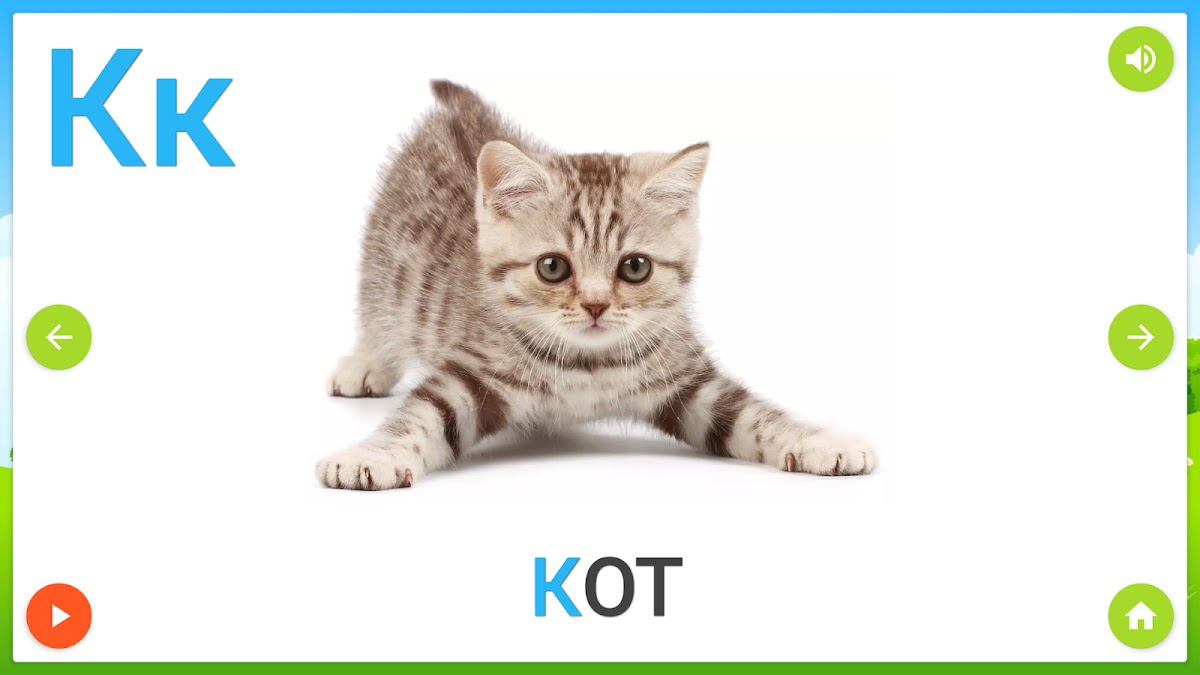 🌳 Режим автоматического листания (слайд-шоу) букв и звуков (листание в порядке следования в алфавите или в случайном порядке) с любой карточки.