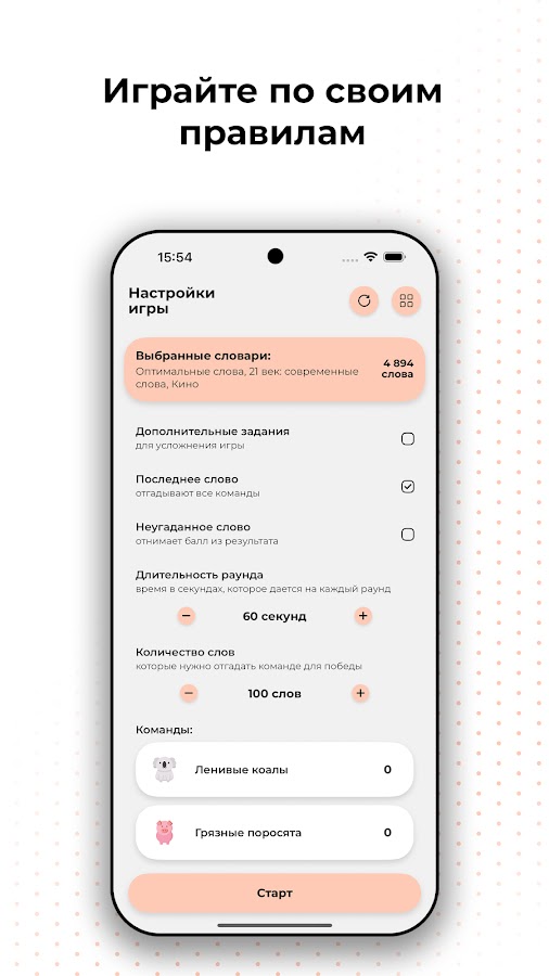 Вы можете настроить игру, изменив продолжительность раунда и необходимое количество слов для победы. Кроме того, в приложении Алиас есть готовые изображения для аватаров и имен команд, но вы также можете настроить их по своему вкусу.