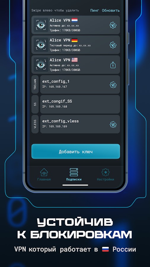 ➜Можно загрузить ключ любого VPN-провайдера (включая бесплатные), настроить свой VPN-сервер или подключить платный сервис Alice VPN.