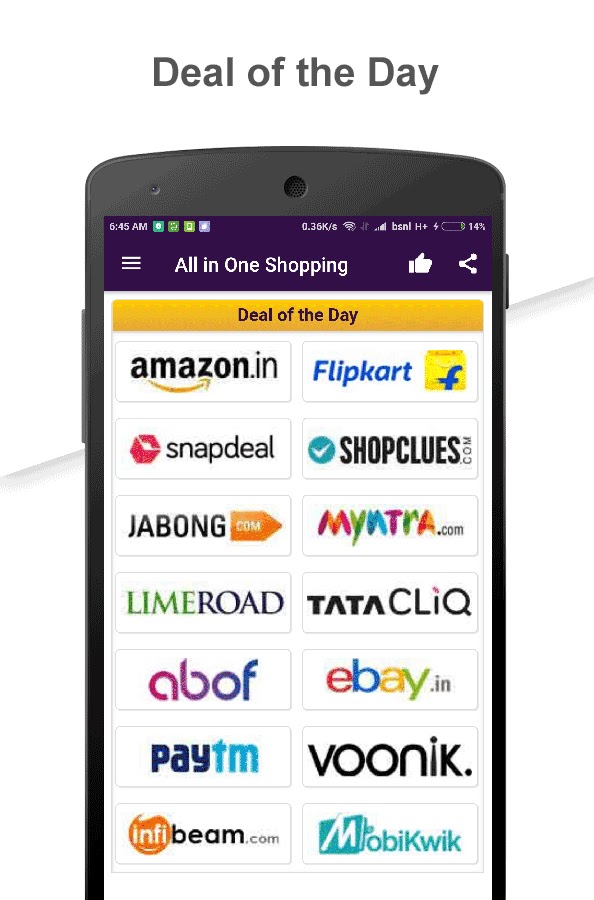 Начиная с версии 1.5, в приложение All in One Shopping добавлена категория «Предложения дня», чтобы получать лучшие ежедневные предложения от лучших приложений для покупок в Индии.