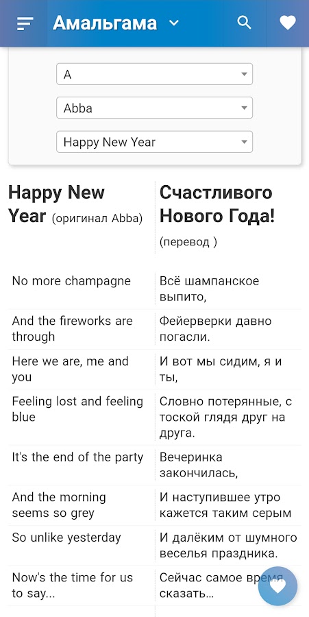 Официальное приложение лингво-лаборатории «Амальгама». Проект с 2005 года занимается переводами песен с различных иностранных языков. В приложении реализована удобная пошаговая навигация, быстрый поиск по базе переводов, а также рейтинг переводов, обновляемый 7 раз в сутки.