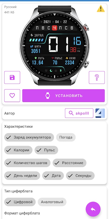 Можно купить подписку и убрать рекламу в приложении🚫 Можно отправить понравившийся циферблат в Избранное, нажав на сердечко рядом с этим циферблатом, а далее посмотреть его нажав на сердечко в нижнем меню🤍 Можно посмотреть Топ 50 установленных циферблатов — за неделю, за месяц и за всё время🔝Так же можно отфильтровать циферблаты по необходимым параметрам, которые вы хотите, чтобы отображались на циферблате🔍 Можно отсортировать циферблаты по дате добавления или по количеству установок 📶 А ещё можно выбрать язык циферблата 🌐 И последнее. Под значком трёх полос в левом нижнем углу есть немного дополнительных функций, которые могут вам пригодится, поэтому загляните ☺️