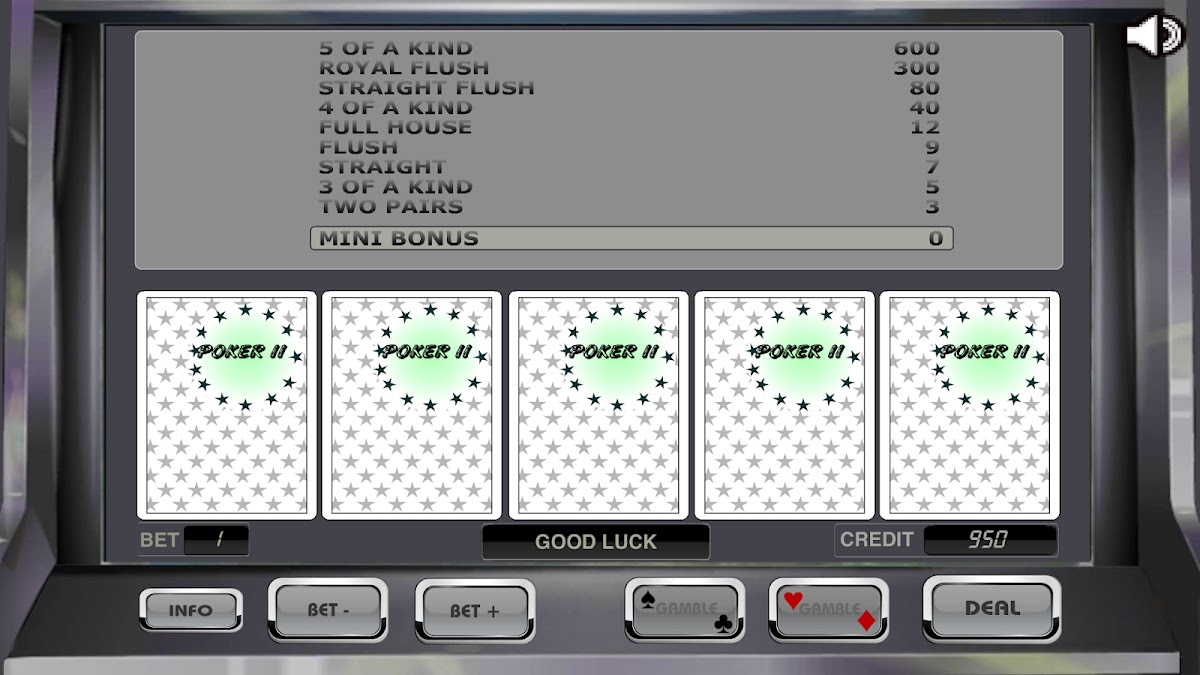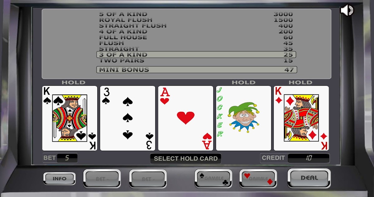 Американский видеопокер с колодой из 52 карт и джокером, два раунда, каждый оплачивается одной ставкой, вторая рука карт автоматически сохраняется для возможной выигрышной комбинации, бонус «Мини-бонус» с накоплением: он накапливается и выигрывает после нескольких последовательных выигрышей «старшей пары / двух валетов» и более. Ставка — до 100 кредитов, максимальная прибыль в основной игре — 300-кратная ставка, дубликат игры.