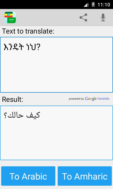 Это приложение способно переводить слова и тексты с амхарского на арабский и с арабского на амхарский.