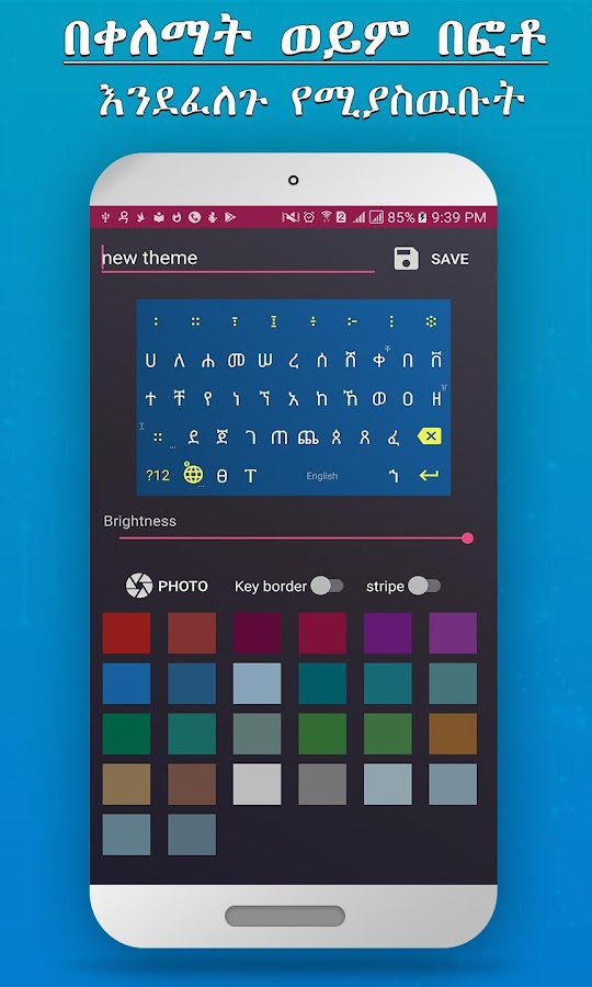 Клавиатура FynGeez Amharic позволяет настроить клавиатуру с помощью цветовых тем и даже создать собственную тему.