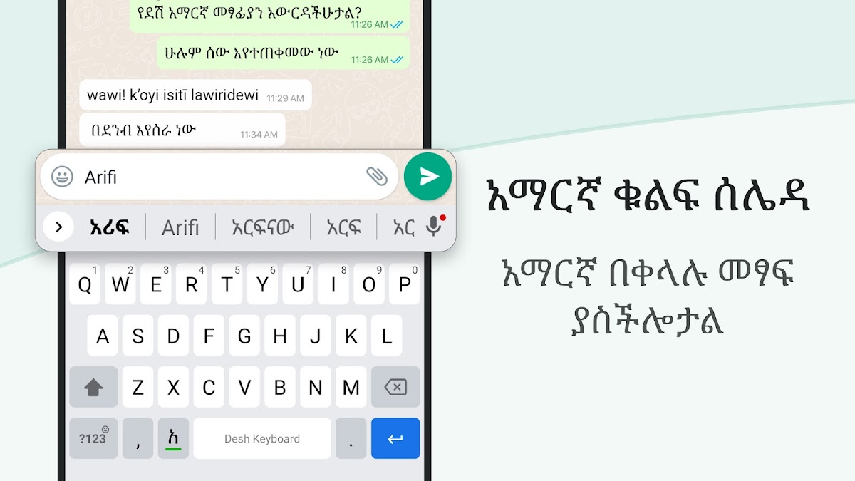 Общайтесь с друзьями и семьей на своем родном языке — используйте родной амхарский текст в любых приложениях для чата или социальных сетей на своем телефоне, как на обычной клавиатуре.