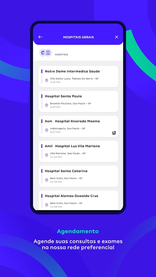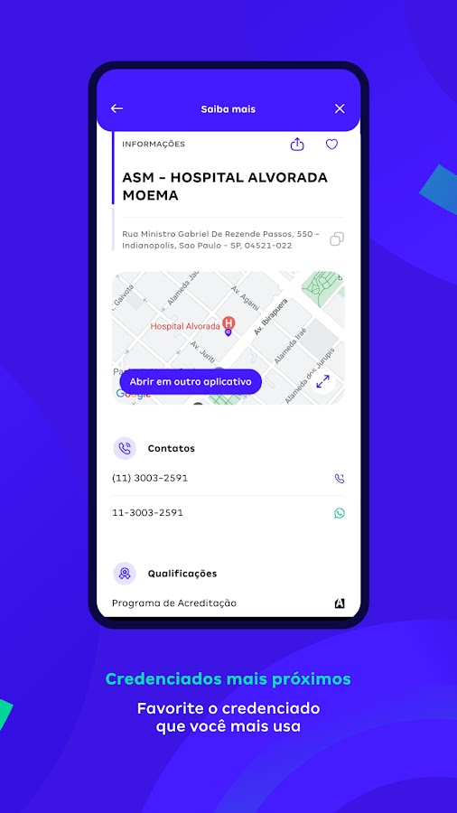 Перемещайтесь по карте и прокладывайте маршруты, чтобы найти ближайшую к вам аккредитованную сеть: здесь есть тысячи врачей, клиник, больниц и диагностических служб. В дополнение к опции виртуального обслуживания вы можете запланировать личную консультацию или экзамены в сети помощи Amil (доступной в будущем по всей Бразилии).