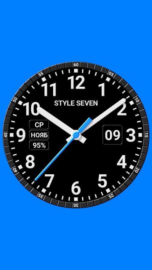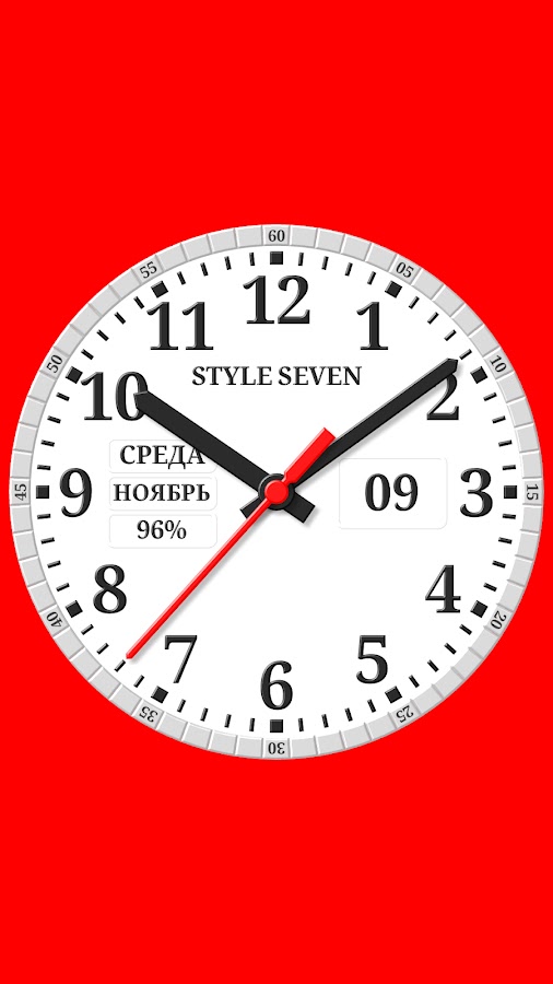 Управляйте внешним видом аналоговых часов: выбирайте цветовую тему, цвет фона и секундной стрелки, можно скрыть или показать дополнительную информацию на экране, использовать полный формат даты, маркеры в виде точек и шрифт с засечками.