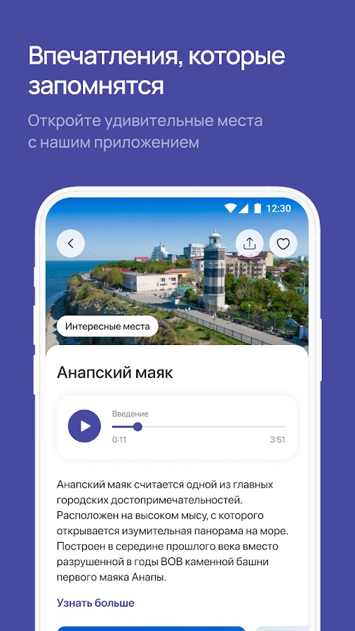 А чтобы было еще интереснее, для всех объектов в приложении доступны панорамы и виртуальные туры. Вы сможете оценить красоты Анапы в полном объеме, не выходя из дома.