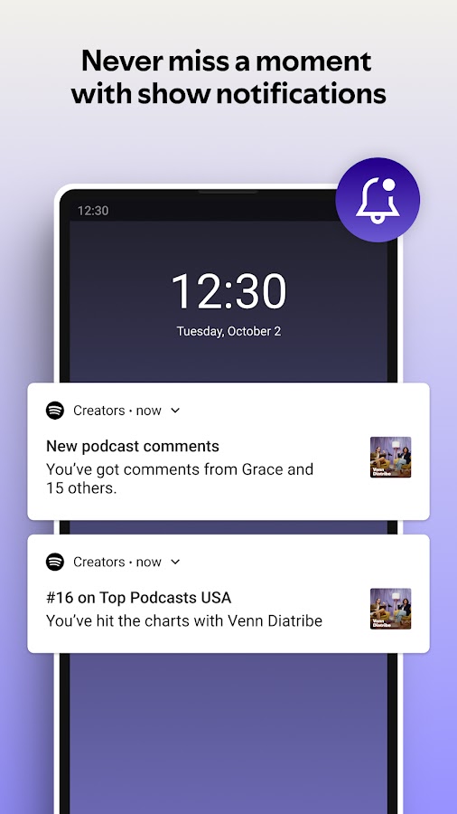 • Получайте уведомления, чтобы быть в курсе событий вашего шоу, в том числе взаимодействия с фанатами, популярных эпизодов, попадания в чарты и других ключевых событий.