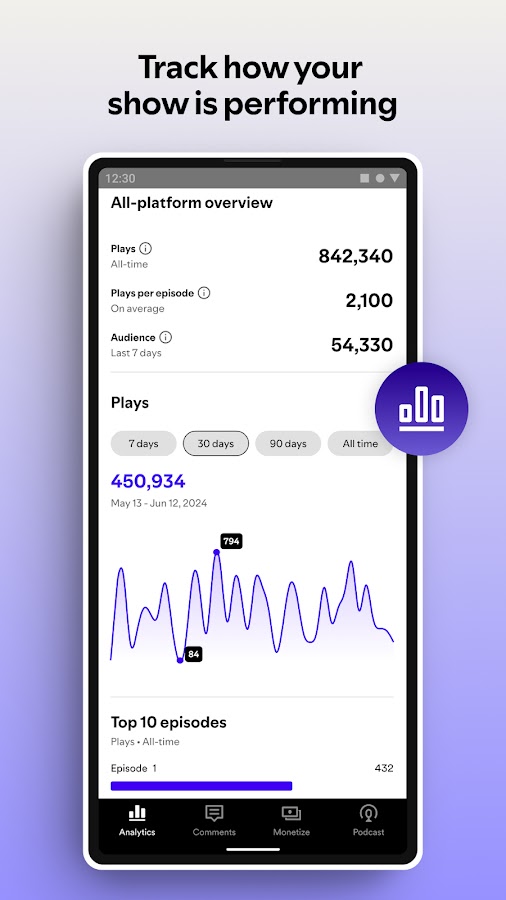 • Развивайте свой подкаст, предоставляя подробную информацию о вашем шоу и аудитории, а также узнавайте, где они находят ваше шоу, с помощью анализа показов.