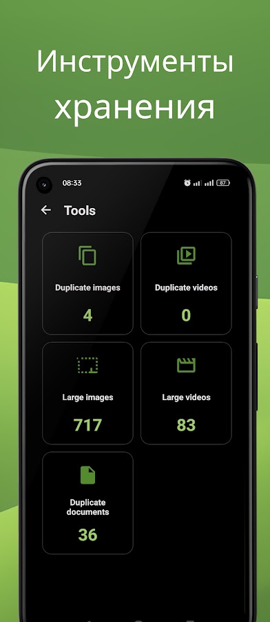 Находите большие изображения, видео большого размера, дубликаты файлов и другой контент, который может занимать место незаметно для вас. Всё чётко организовано для быстрой проверки и безопасной очистки.