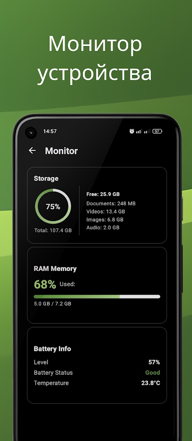 Визуальный раздел, где вы можете просмотреть полезную информацию о своём устройстве, например доступное место в памяти и другие важные данные, представленные в понятной форме.