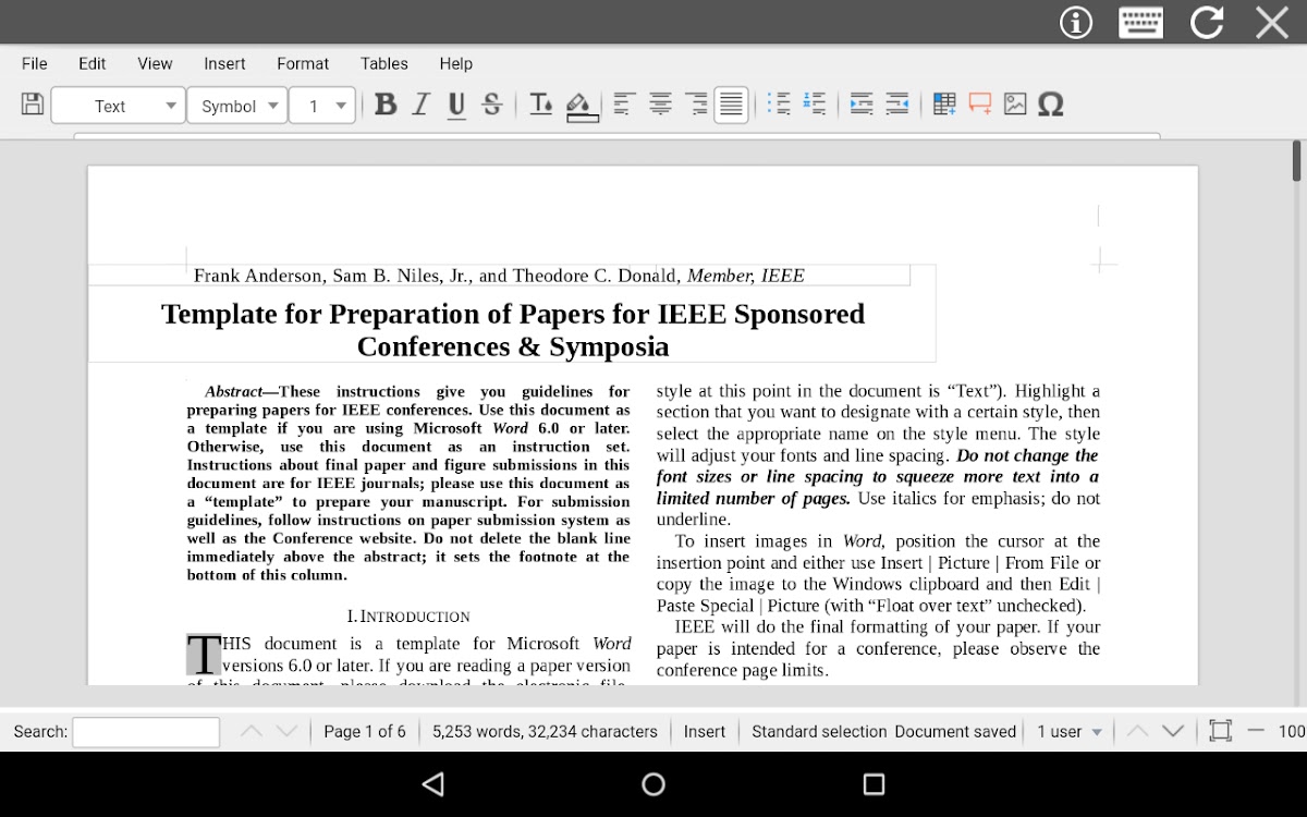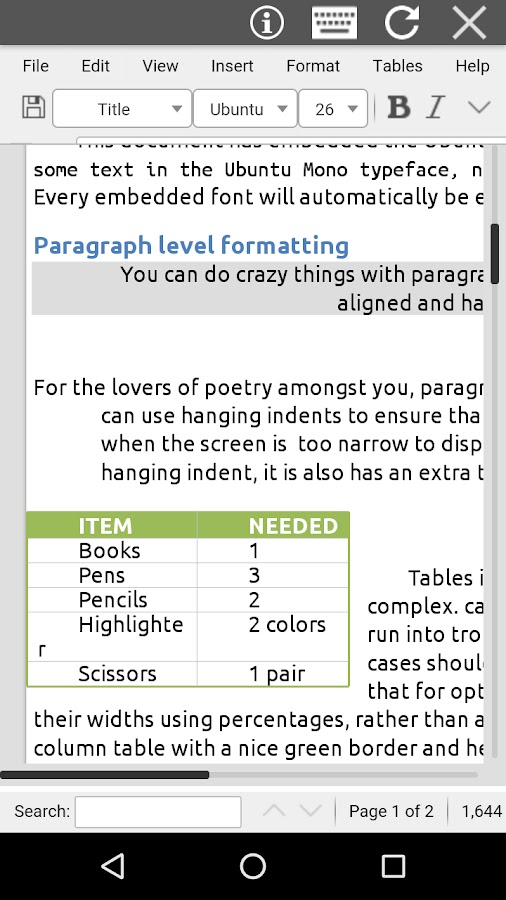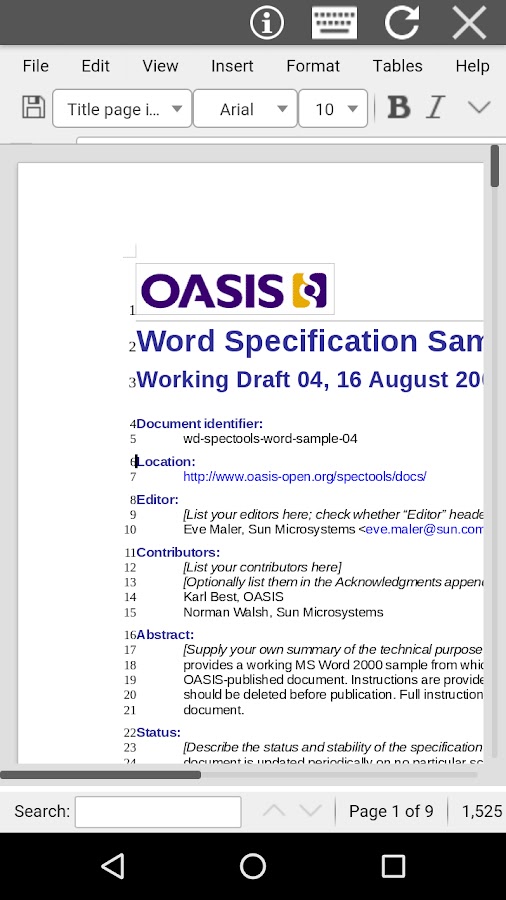 — Форматы документов, поддерживаемые являются OpenDocuments форматы (ODT и .ott), но в дополнение к ним AndroDOC может открывать форматы, используемые Microsoft (.doc и .docx) (см https://wiki.openoffice.org/wiki/ Документация / OOo3_User_Guides / Getting_Started / File_formats):