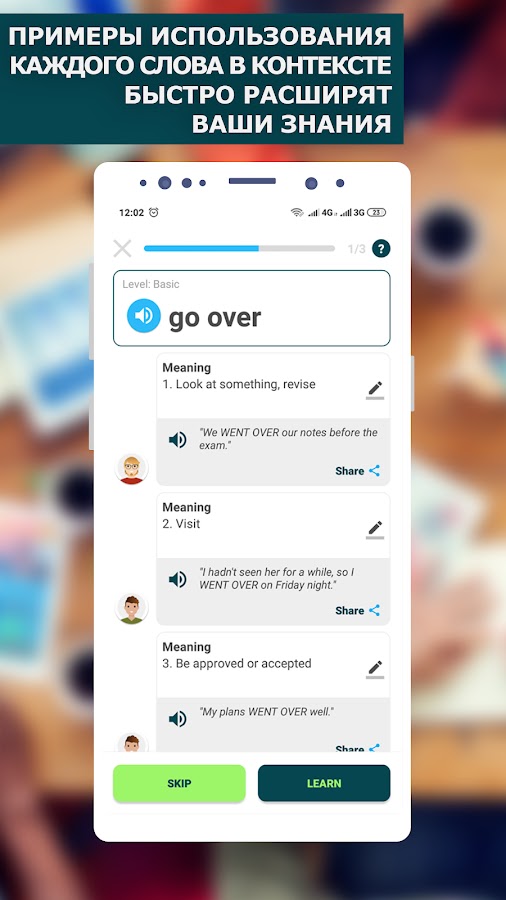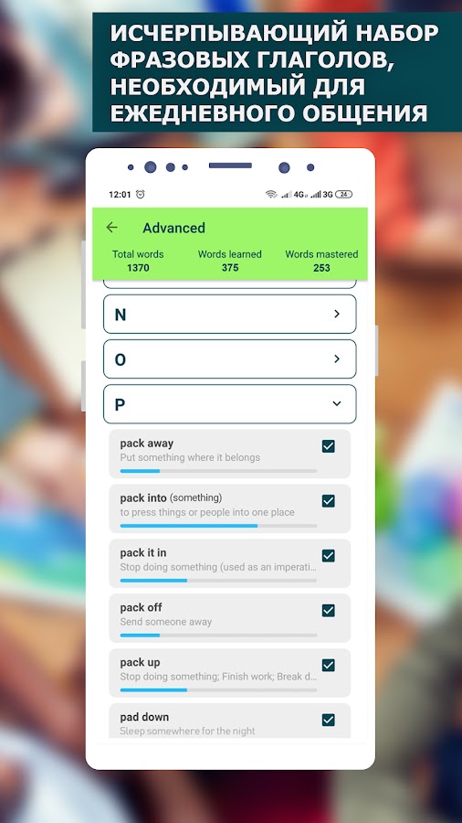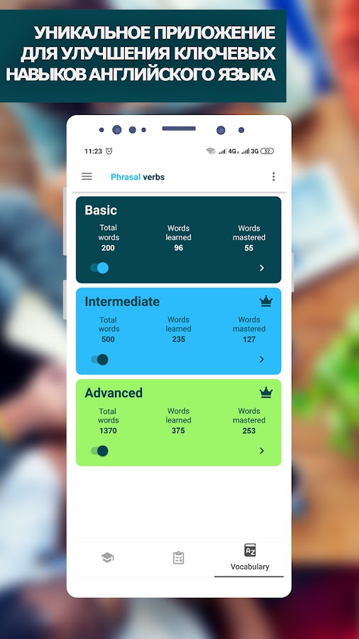 Методика интервальных повторений, примененная в приложении, позволяет быстро учить новые слова. В английском языке существует около десяти тысяч фразовых глаголов. Здесь мы постарались собрать около двух тысяч, которые наиболее часто употребляются как в бытовой английской лексике, так и в популярных и специализированных ресурсах (National Geographic, TED, British Council и т.д.), периодических изданиях (People, Forbes, The Economist, Oxford University Press и т.д.), популярных фильмах и сериалах (Interstellar, Joker, The Big Bang Theory, Breaking Bad, Friends и т.д.), для наиболее полного освоения данной темы. С помощью приложения Вы сможете быстро выучить новые слова, расширив словарный запас, и улучшить свой разговорные навыки. Эти знания откроют для Вас качественно новые возможности общения на английском языке. Мы структурировали материал по уровням сложности, стараясь сделать процесс обучения максимально интересным и эффективным.