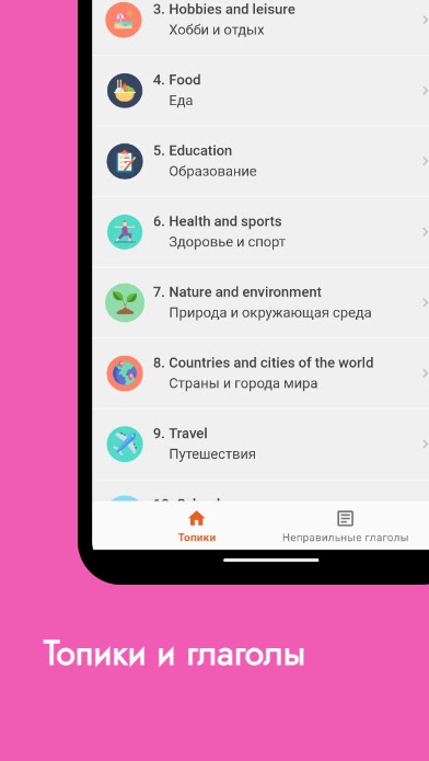 Приложение «Топики и неправильные глаголы английского» — это удобный инструмент для изучения английского языка. Оно включает: