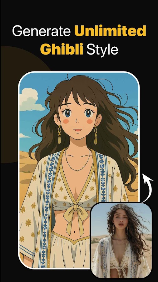 Шагните в мир аниме с Ghibli AI, лучшим создателем мультфильмов на базе ИИ! Мгновенно превращайте свои фотографии в захватывающие дух аватары в стиле аниме, персонажей манги и шедевры мультяшек всего одним нажатием. Независимо от того, являетесь ли вы поклонником волшебного стиля искусства Studio Ghibli или любите портреты аниме, созданные ИИ, это приложение оживит ваше воображение.