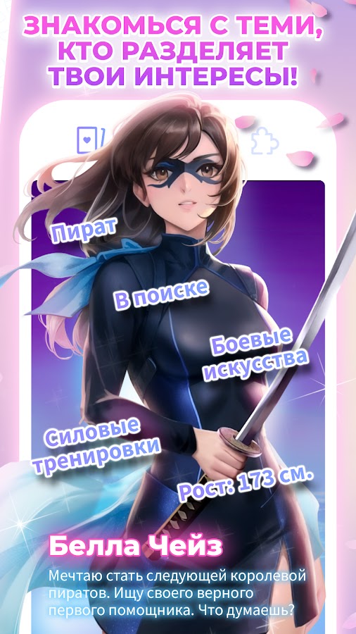 Исследуйте огромный выбор потенциальных партнёров, свайпая через профили. Каждый персонаж по-своему очарователен и имеет свою уникальную историю и интересы. Ваш выбор имеет значение: свайпните вправо, чтобы найти идеального партнёра и отправиться в путешествие по истории любви. Романтика ждет вас!