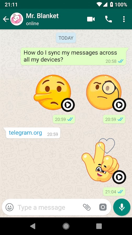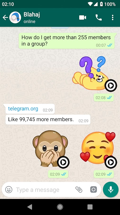 Отправка их очень легко, просто выберите анимированные смайлики с выражением вам нравится, и он будет играть автоматически, они GIF для WhatsApp в виде наклеек.