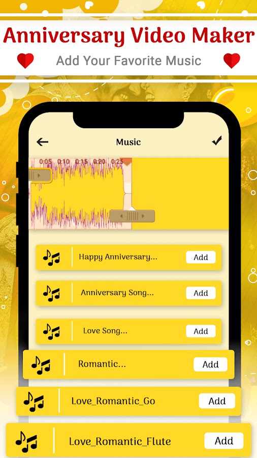 Выберите музыкальную композицию, которая лучше всего соответствует вашему случаю, из коллекции бесплатных музыкальных композиций в библиотеке Anniversary Video Maker With Music.