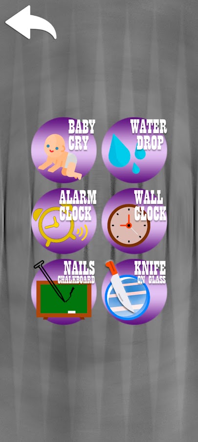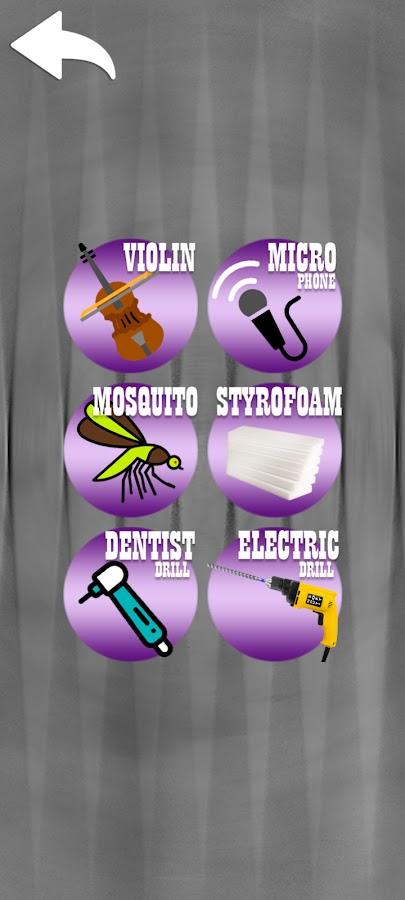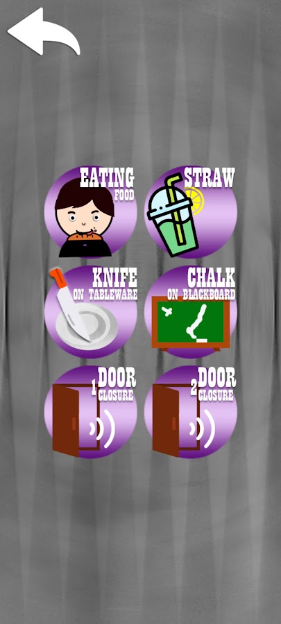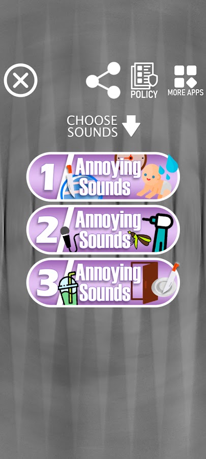 В приложении содержится 18 раздражающих звуков таких как: звук плачущего ребёнка, звук капающей воды, звуки тиканья часов, сломанной скрипки, фонящего микрофона, назойливого комара, звук дрели, чавканья еды, звуки скрипящей двери и так далее.