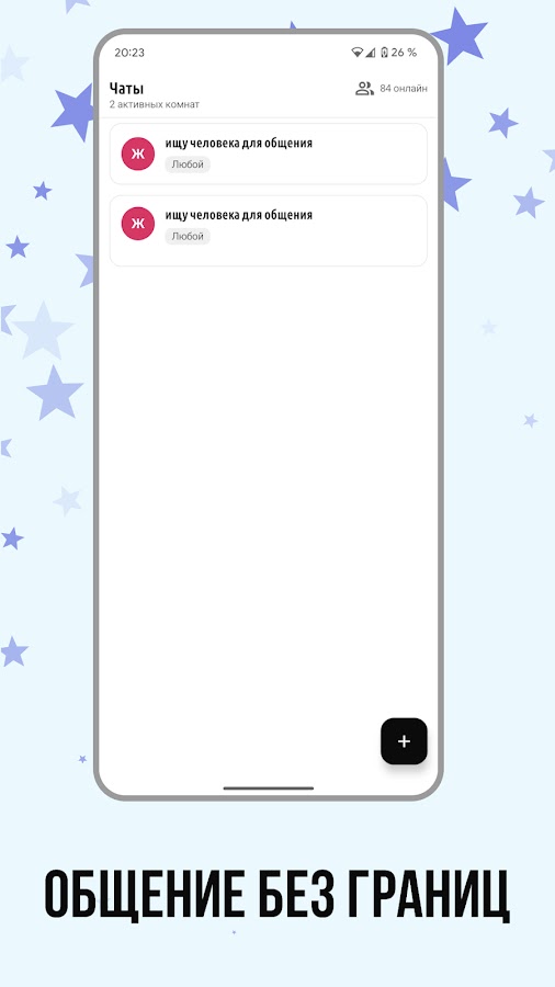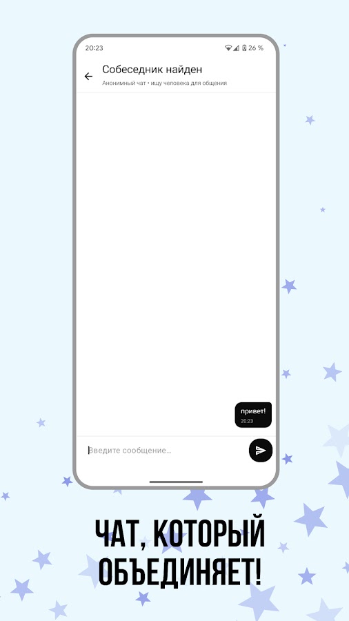 Наше приложение — это современный анонимный чат, где ты можешь свободно общаться, заводить друзей и находить единомышленников без регистрации и отсутствия данных.