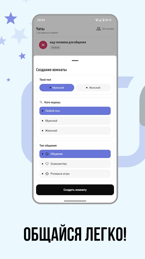 Создай комнату — выбери свой пол, кого ищешь и формируешь общение.