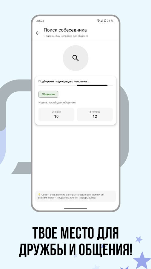 Быстрый подбор собеседника — начинай общаться за секунды.