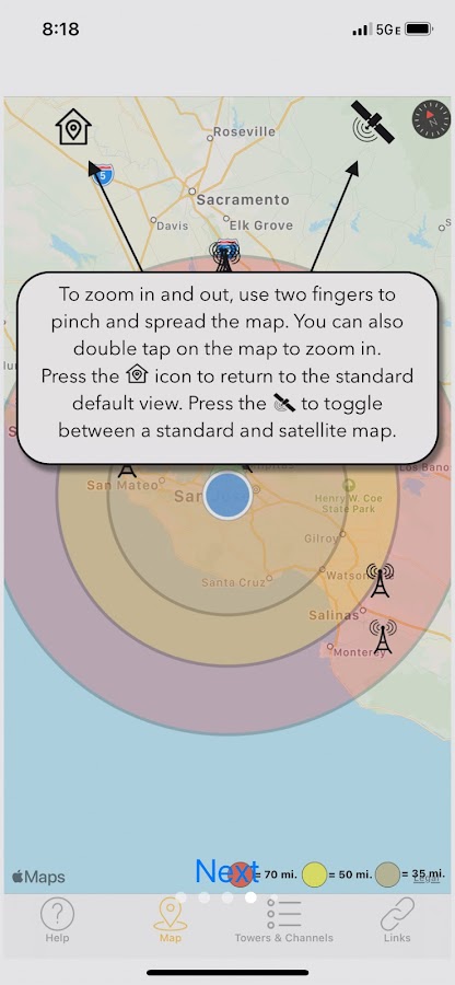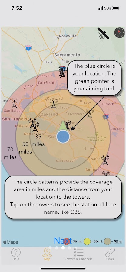 С Antenna Point направить телевизионную антенну очень просто! На карте в приложении будут отображаться передающие вышки, а также расстояние от вашего дома до каждой вышки. Antenna Point определит ваше местоположение и предоставит зону покрытия телевизионной антенны в пределах 35 миль, 50 миль и 70 миль. Приложение поможет вам найти лучшее направление для внутренней, чердачной или наружной телевизионной антенны. Загрузите приложение Antenna Point на свой смартфон или планшет, прочитайте пошаговые инструкции и начните направлять свой смартфон или планшет на самую большую группу вышек. После того, как вы нашли лучшее направление ко всем башням, установите антенну в месте с лучшим беспрепятственным обзором телебашен. Подключите антенну к телевизору и используйте пульт дистанционного управления для поиска каналов на телевизоре. Вышки отображаются черными маркерами на карте, и вы можете нажать на каждую вышку, чтобы увидеть позывной основной сети, такой как ABC, NBC, CBS, FOX, PBS, The CW, ION, MeTV и многие другие. Приложение включает в себя список каналов, так что вы можете просмотреть телевизионные станции, доступные в вашем регионе.
