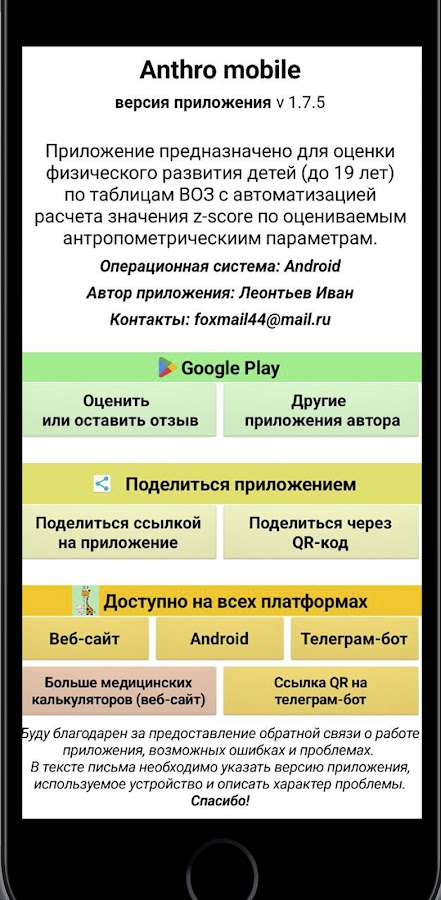 Anthro Mobile — это приложение для оценки физического развития у детей в возрасте от 0 до 18 лет. В основе приложения лежат стандарты, разработанные Всемирной организацией здравоохранения (ВОЗ 2007 0-5 лет и 5-18 лет). Оценка производится на основании введенных данных роста, веса, пола и возраста с расчетом точного значения z-score и его оценкой в соответствии с современной методикой. В зависимости от возраста могут быть оценены различные показатели: рост к возрасту, вес к возрасту, вес к росту, ИМТ к возрасту. Предусмотрены несколько способов расчета возраста (по дате рождения и осмотра, ввод вручную в годах или месяцах). Приложение позволяет сохранять результаты конкретного обследования в память телефона с возможностью ведения локальной базы данных.