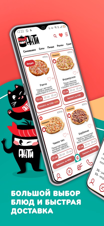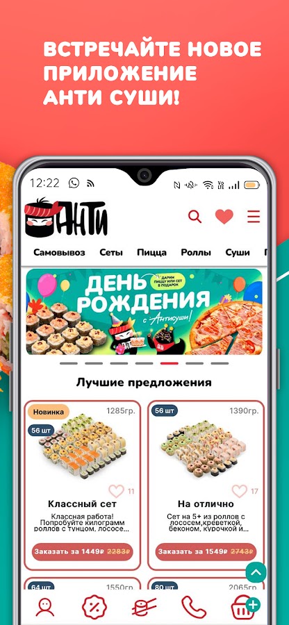 Если Вы хотите заказать вкусные суши на дом или ищете удобную и быструю доставку пиццы, если вам нужны горячие обеды в офис, недорогие сеты роллов или комбо-наборы для веселой вечеринки с друзьями — все это найдется в приложении «Анти Суши – доставка еды», у нас есть: